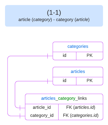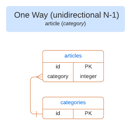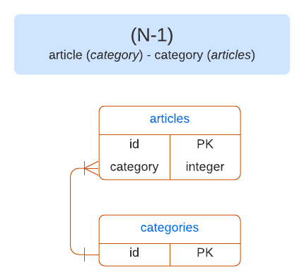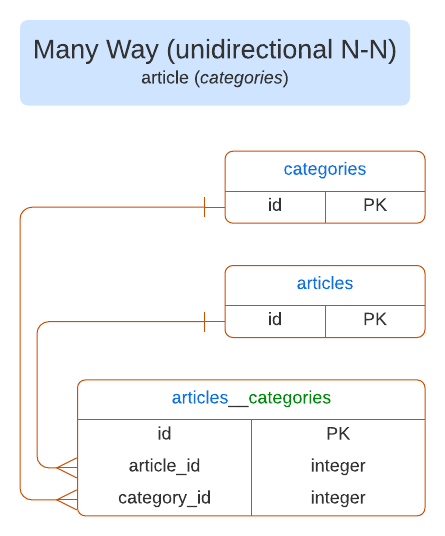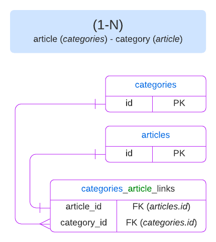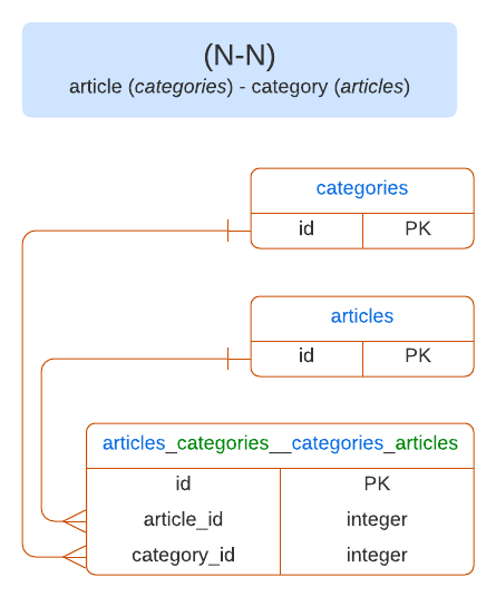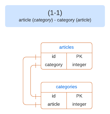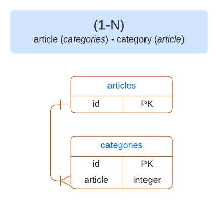 This documentation is built around an example using 2 different database entities: article and category. The example simulates adding a relation to the article entity pointing towards the category entity. For each relation type, the following sections illustrate: