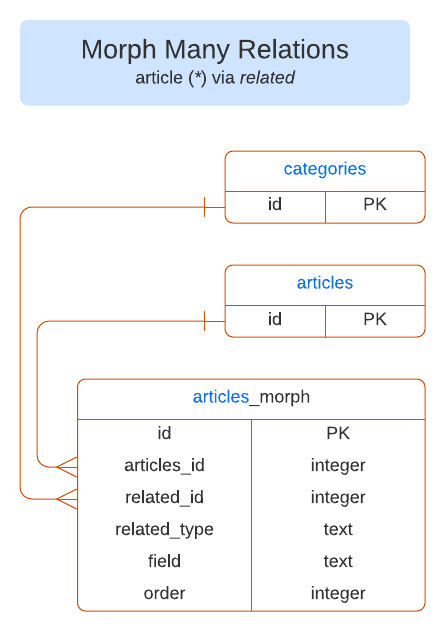 In Strapi v4, a morph table is created for every entity/morph relation defined in the schema. If a single entity has 2 morph relations, 2 different tables are created and named using the following format: entity_attribute_morphs.